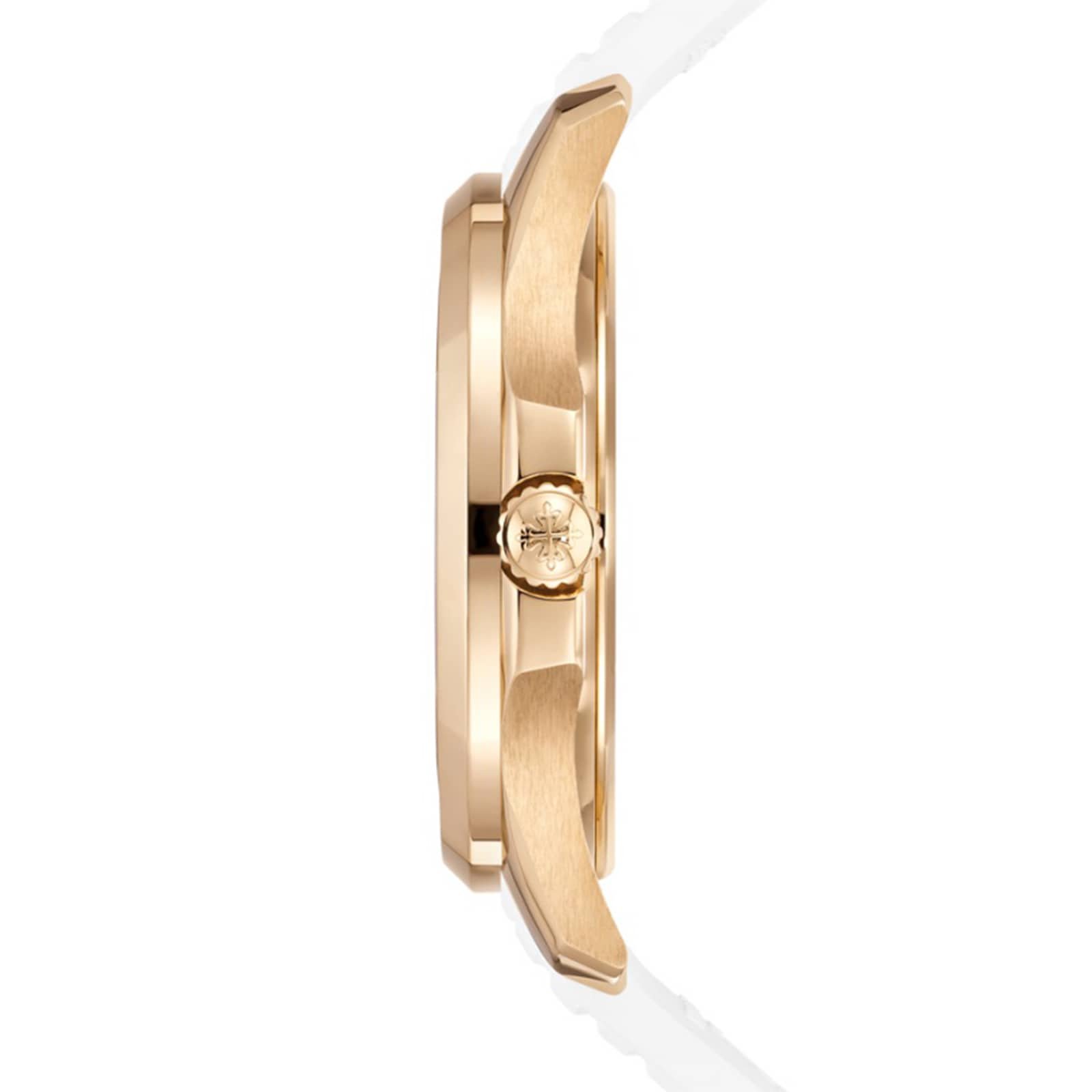 The Aquanaut Luce collection welcomes a new ladies’ travel watch with the new E 23-250 S FUS 24H Travel Time (dual time zone) quartz movement. The discreet and practical crown adjustment system ensures the Aquanaut Luce remains as elegant as ever. The 38.8 mm rose gold case, featuring contrasting polished and satin finishes, is water-resistant to 60 m. It is paired with a matte white dial and an integrated composite strap. The bezel is lit up by 48 diamonds (~1.11 ct), while the patented fold-over clasp is secured by four independent catches.