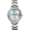 Ballon Bleu de Cartier watch, 33 mm, mechanical movement with automatic winding. Steel case, fluted crown set with a synthetic cabochon-shaped spinel, blue silvered sunray-brushed dial, blued-steel sword-shaped hands, sapphire crystal, interchangeable steel bracelet. Thickness: 9.96 mm. Water-resistant up to 3 bar (approx. 30 meters/100 feet).