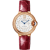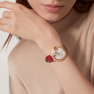 Ballon Bleu de Cartier watch, 33 mm. Self-winding mechanical movement. Rose gold 750/1000 case set with 47 brilliant-cut diamonds totaling 0.68 carats. Fluted crown decorated with a cabochon sapphire. Matt silvered stamped sunray dial set with 21 brilliant-cut diamonds totaling 0.10 carats. Blued-steel sword-shaped hands. Sapphire crystal. Interchangeable bracelet in rose gold 750/1000. Thickness: 0.4”. Water-resistant up to 3 bar (approx. 30 meters/100 feet).