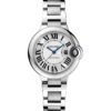 Ballon Bleu de Cartier watch, 33 mm, self-winding mechanical movement.Steel case and 18K pink gold fluted crown decorated with a synthetic cabochon-shaped spinel.18K pink gold bezel set with 50 brilliant-cut diamonds totaling 0.63 carats.12-zone flinque dial set with 11 brilliant-cut diamonds totaling 0.05 carats.Blued-steel sword-shaped hands.Sapphire crystal.18K pink gold and steel bracelet, wrist size: 175 mm