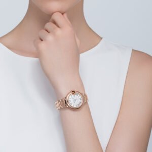 Ballon Bleu de Cartier watch, 33 mm, mechanical movement with automatic winding. 18K pink gold case and fluted crown set with a sapphire cabochon. 12-zone flinque dial with silvered lacquered sunray effect set with 11 diamonds totaling 0.05 carats. Blued-steel sword-shaped hands. Sapphire crystal. Shiny purple leather strap with 14 mm 18K pink gold ardillon buckle.