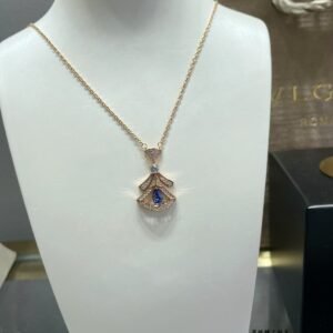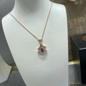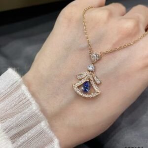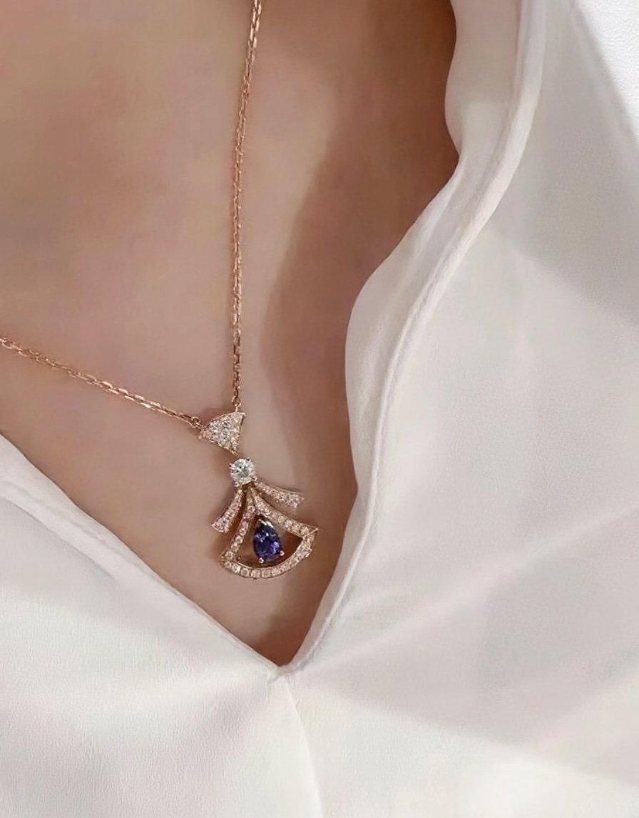 A refined expression of joyful femininity, the Divas’ Dream 18 kt rose gold necklace offers an elegant and colorful interpretation of the iconic fan-shaped motif. Deeply rooted in Bvlgari’s Roman heritage, the aesthetic signature of the collection is rendered through a delicate openwork frame with pavé diamonds embracing a pear-shaped tanzanite. Evoking the enchanting nuances of a Roman night sky, the creation is an ode to timeless beauty.