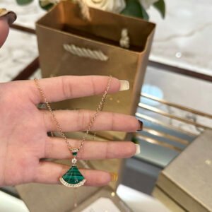 A refined expression of joyful femininity, the Divas’ Dream 18 kt rose gold necklace offers a colorful interpretation of the iconic fan-shaped motif. Deeply rooted in Bvlgari’s Roman heritage, the aesthetic signature of the collection is rendered through a delicate pendant artfully set with a green malachite element and lit by pavé diamonds. Graceful and timeless, the creation is an ode to spontaneous beauty.