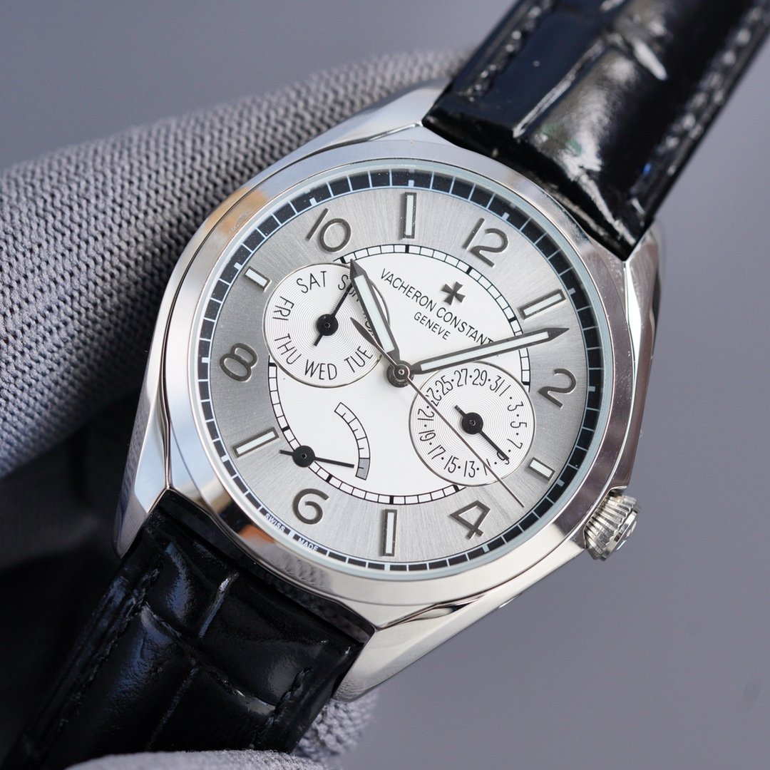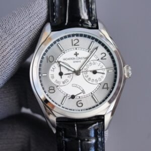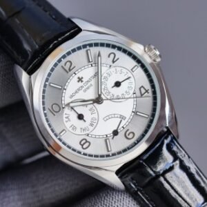Dial descriptionDouble finished silver-toned dial: opaline center and sunburst satin exterior. Snailed day and date counters. 18K gold baton-type hour/minute hands. 18K gold hour-markers and Arabic numerals. Hour/minute hands and hour-markers highlighted with blue SuperLuminova®.