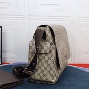 GG Supreme canvas diaper bag, designed with multiple pockets and fold-out changing mat.