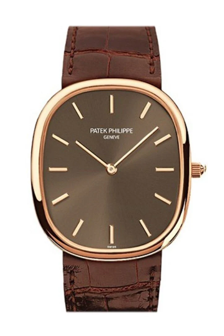 18 kt rose gold case with a brown leather bracelet. Fixed 18 kt rose gold bezel. Chocolate brown sunburst dial with rose gold-tone hands and index hour markers. Dial Type: Analog. Automatic movement with 48 hour power reserve. Scratch resistant sapphire crystal. Solid case back. Case diameter: 31.1 x 35.6 mm. Case thickness: 2.53 mm. Tonneau case shape. Band width: 19 mm. Tang clasp. Water resistant at 30 meters / 100 feet. Functions: hour, minute. Luxury watch style. Watch label: Swiss Made. Patek Philippe Golden Ellipse Automatic Brown Dial 18 kt Rose Gold Men’s Watch 3738/100R/001.