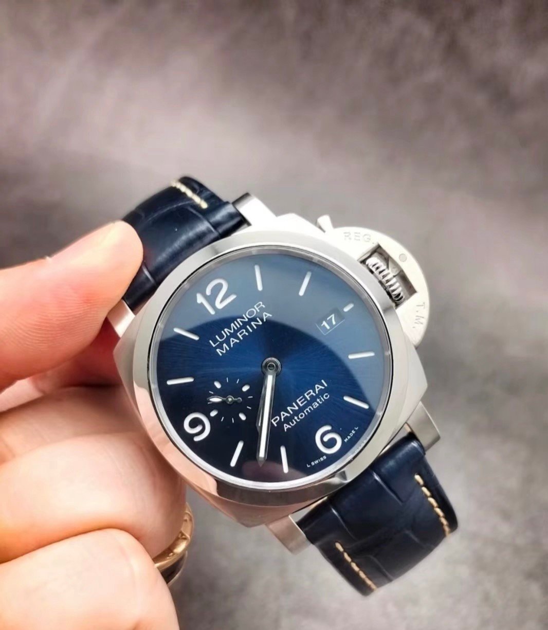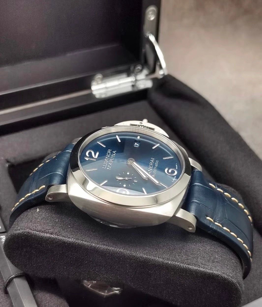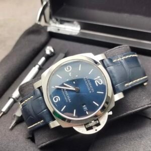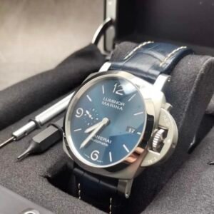 Blue sun-brushed with luminous Arabic numerals and hour markers. Date at 3 o’clock and small seconds at 9 o’clock