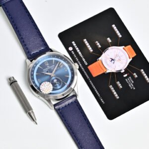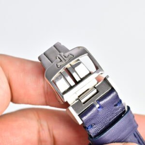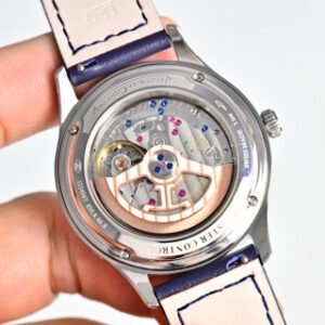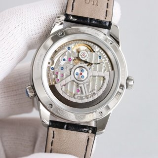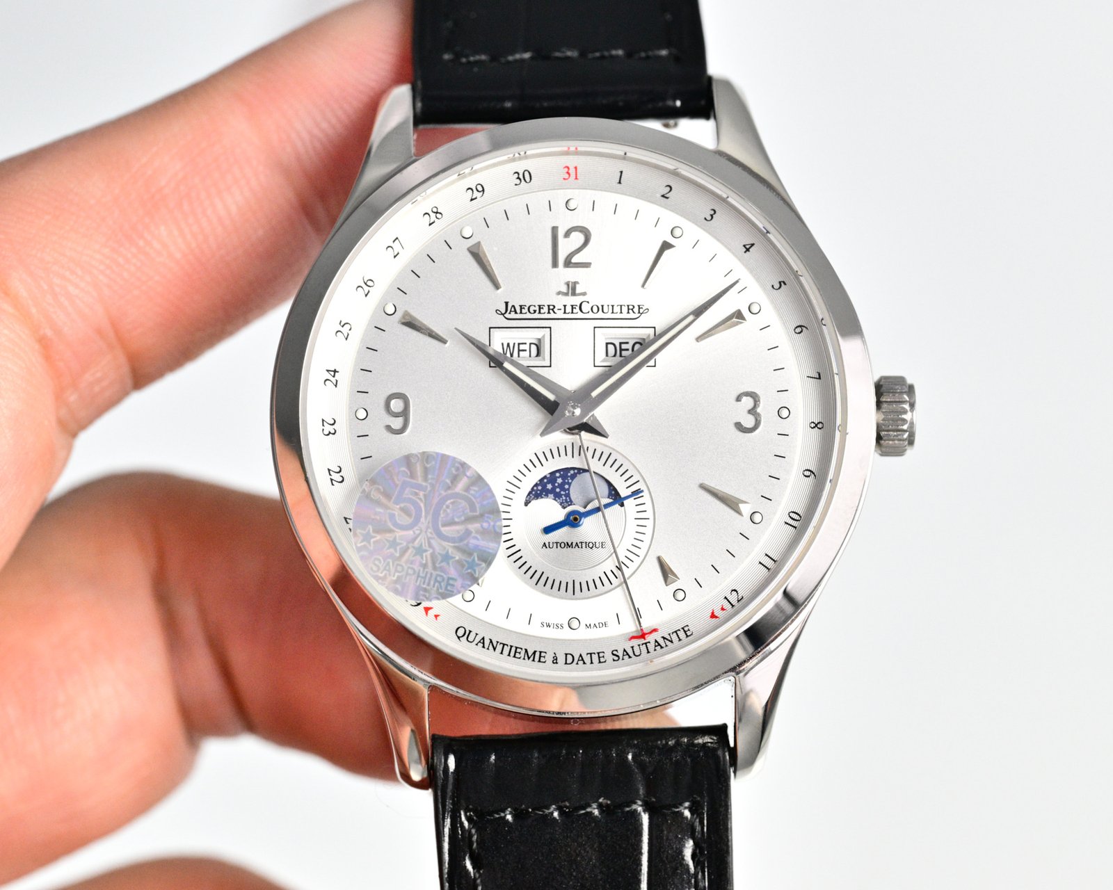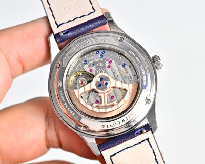 In its 40-mm case in pink gold, the new Master Control Calendar offers its complications their most beautiful role. It gives the time but also the complete calendar, not to mention its ingenious jumping date, finished with a refined red Jaeger-LeCoultre anchor. As its name suggests, this complication allows the date indicator to literally jump between the 15th and the 16th day of the month, ceding place for the moon phase. In an aperture at 6 o’clock, the star of the night is revealed or hidden against a background of the starry midnight blue sky.