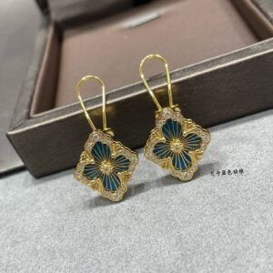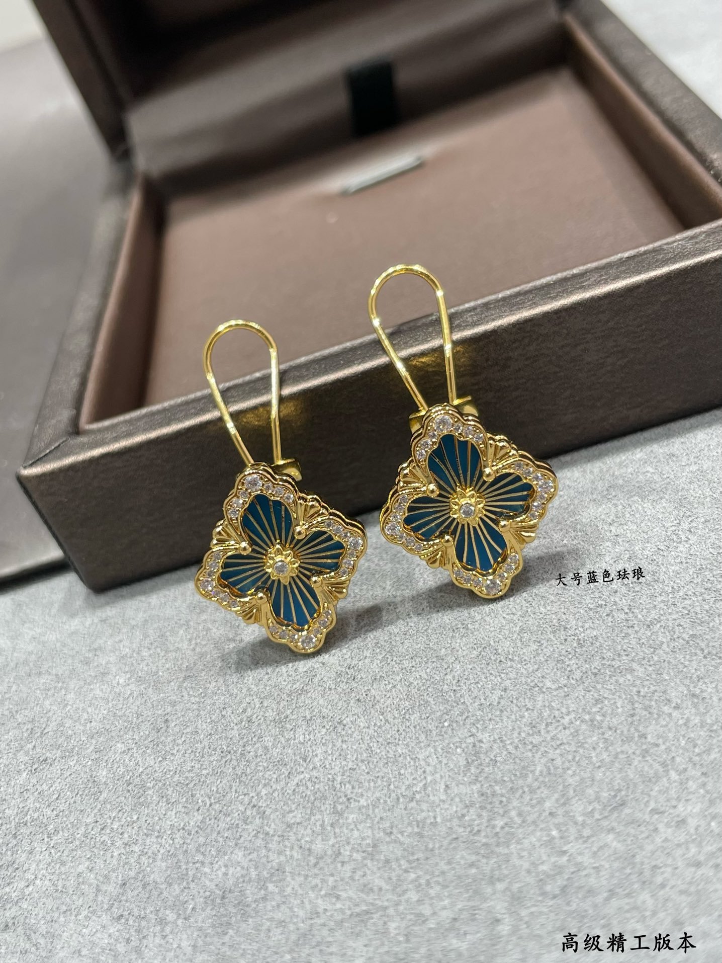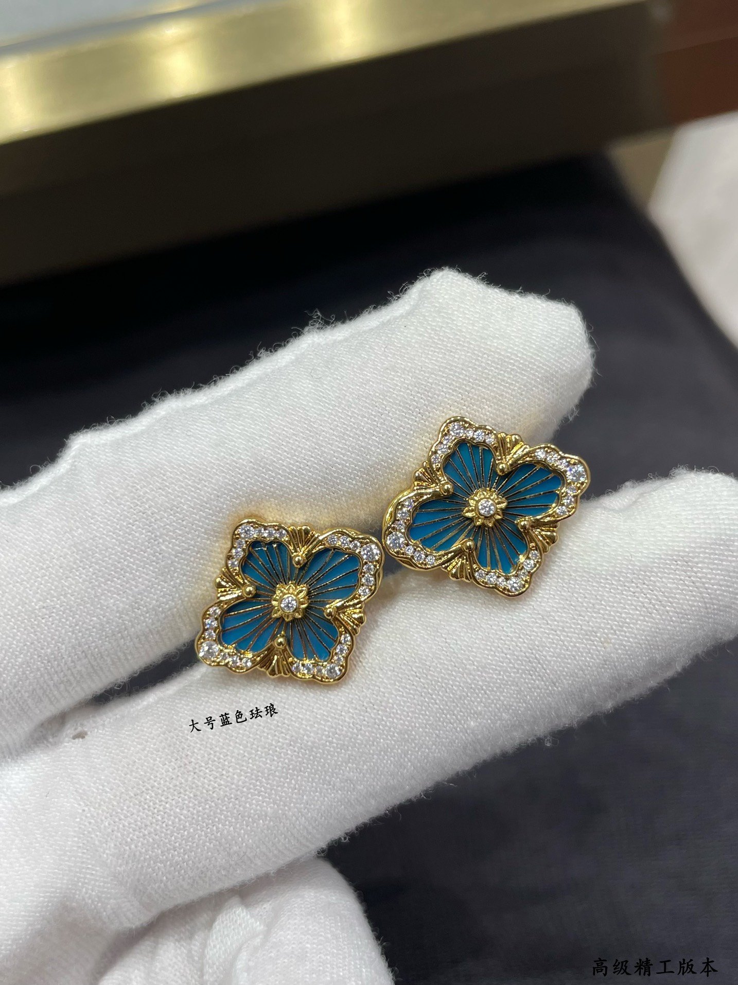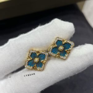 OPERA TULLE YELLOW GOLD BUTTON EARRINGS WITH BLUE ENAMELED ELEMENT