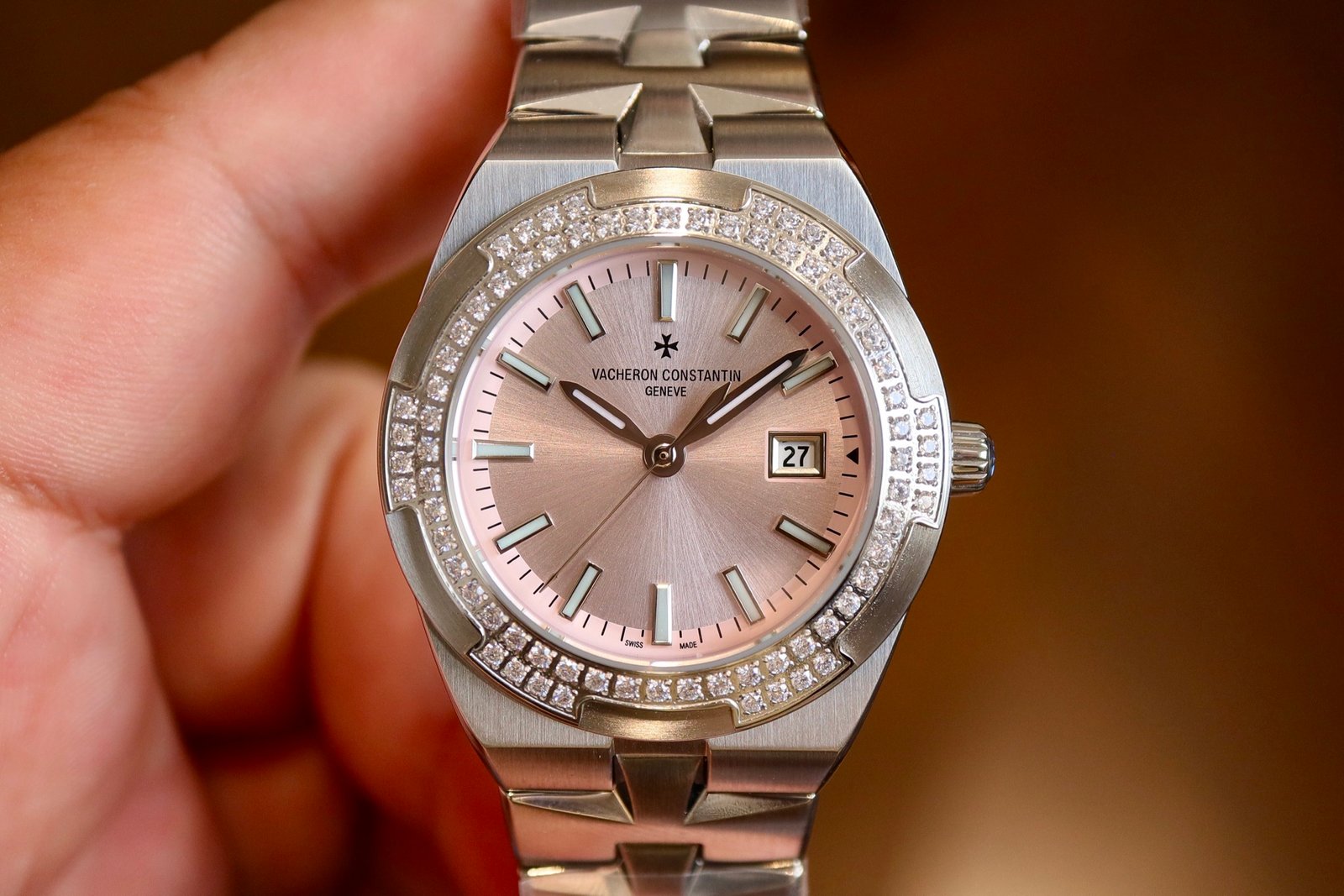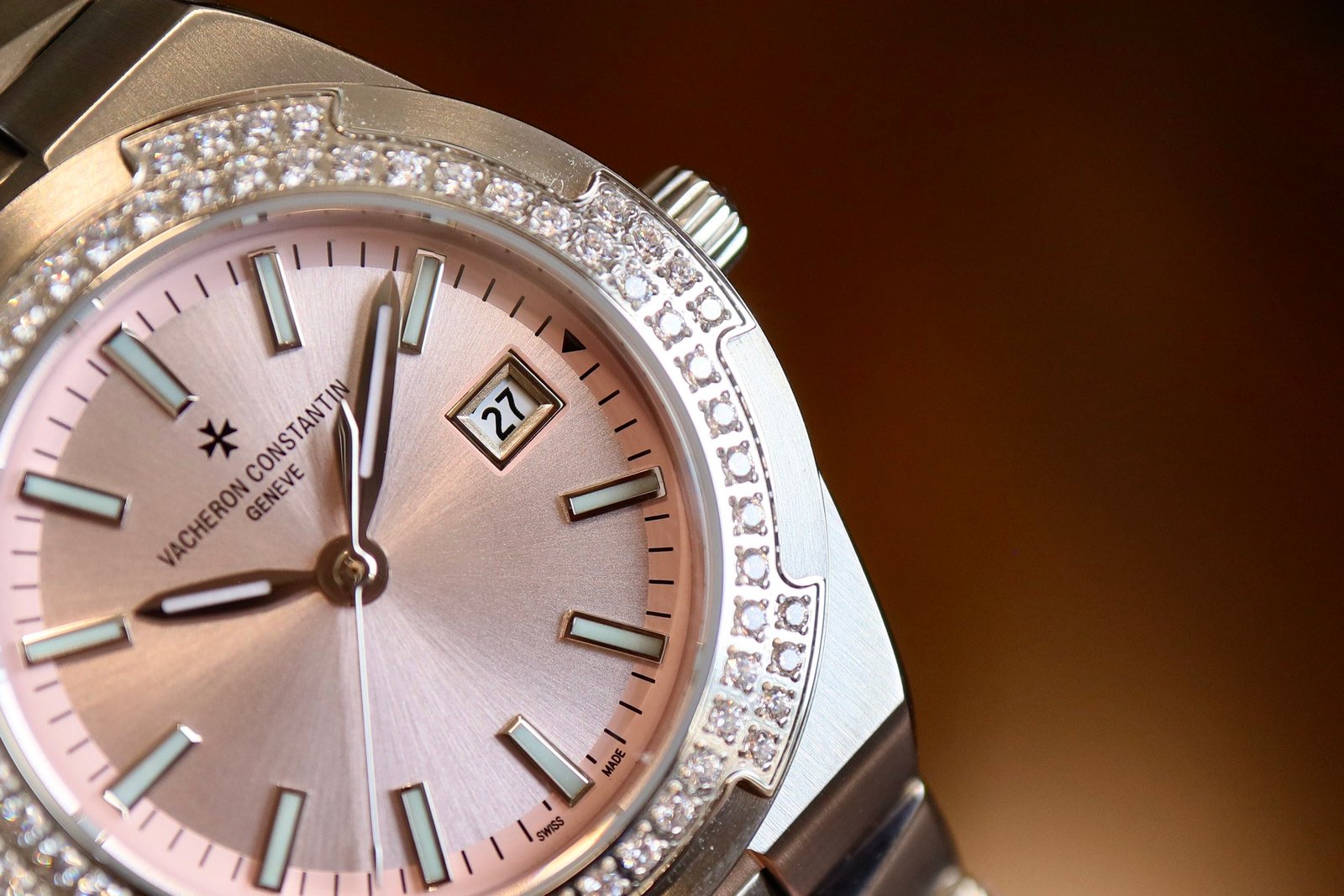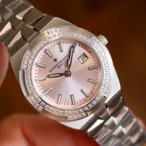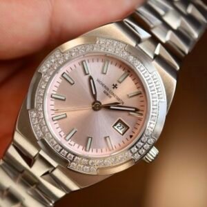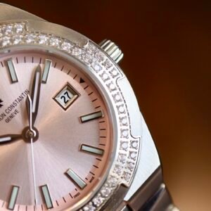 Dial descriptionSunburst satin-finished lacquered pink dial and velvet-finished minutes track. Date at 3 o’clock. 18K gold applied hour/minute hands and hour-markers highlighted with blue SuperLuminova®.