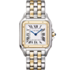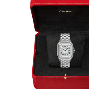 Panthère de Cartier watch, large model, quartz movement. Steel case, dimensions: 31 mm x 42 mm, thickness: 6.71 mm, steel case, crown with a blue synthetic spinel, silvered dial, blued-steel sword-shaped hands, steel bracelet. Water-resistant up to 3 bar (approx. 30 meters/100 feet).