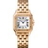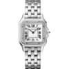 Panthere de Cartier watch, medium model, quartz movement. Case in steel, bezel set with brilliant-cut diamonds, crown set with a synthetic blue spinel, silvered dial, blued-steel sword-shaped hands, steel bracelet,