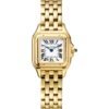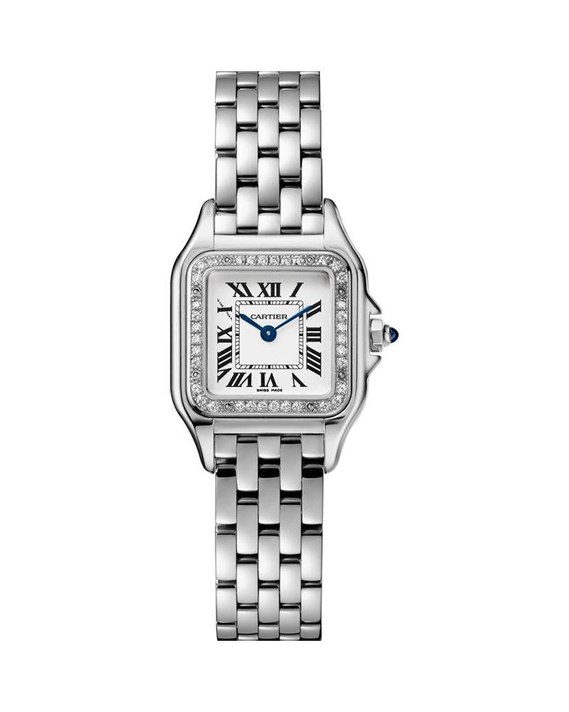 Panthere de Cartier watch, small model, quartz movement. Case in steel, bezel set with brilliant-cut diamonds, crown set with a synthetic blue spinel, silvered dial, blued-steel sword-shaped hands, steel bracelet