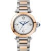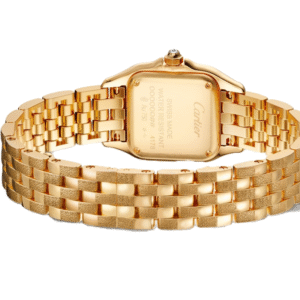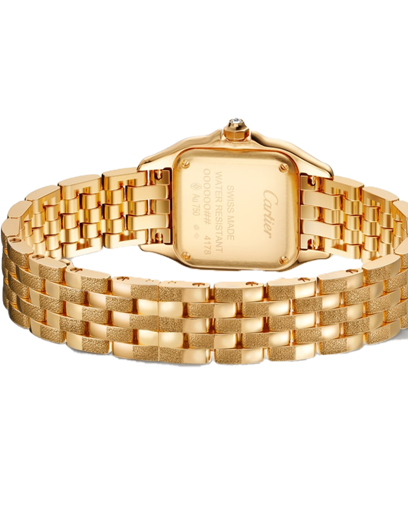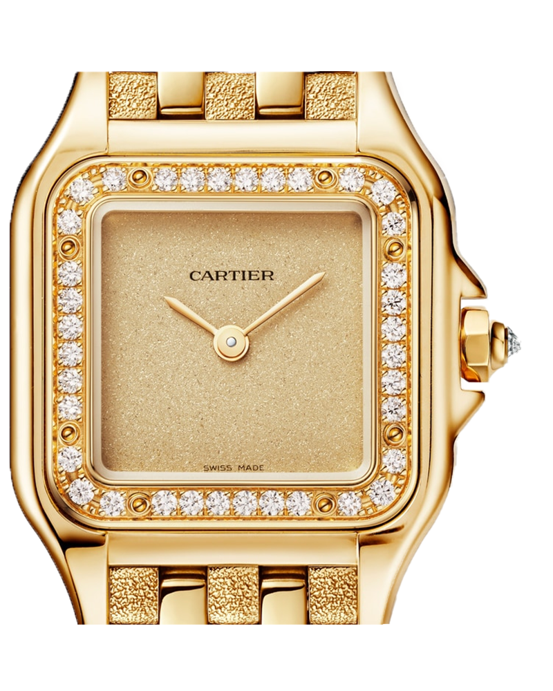 Panthère de Cartier watch, small model, quartz movement. Yellow gold 750/1000 case set with 37 brilliant-cut diamonds totalling 0.26 carats. Dimensions: 22 mm x 30 mm, thickness: 6 mm. Yellow gold 750/1000 octagonal crown set with a brilliant-cut diamond totalling 0.02 carats. Golden grained dial with sparkling effect, gold-finish sword-shaped hands, textured yellow gold 750/1000 bracelet. Water-resistant up to 3 bar (approx. 30 metres).