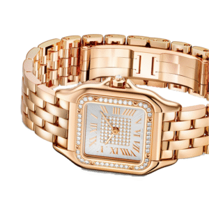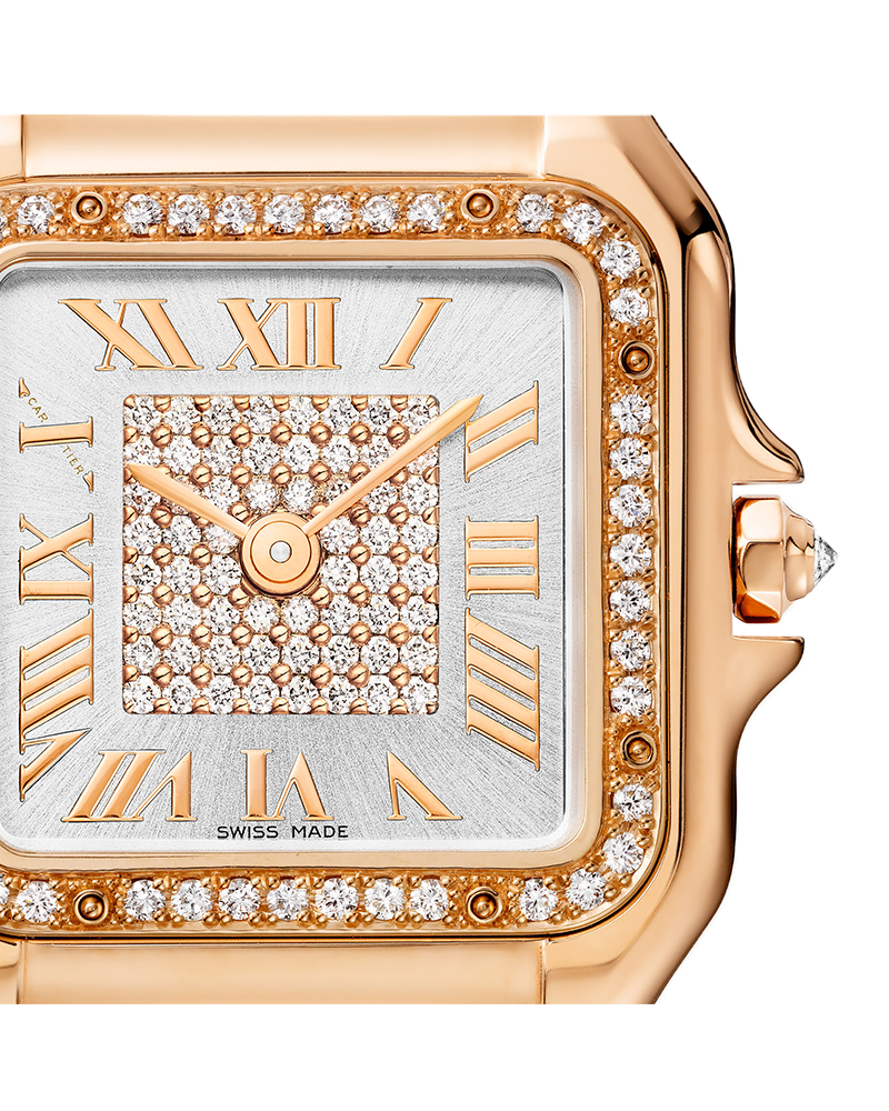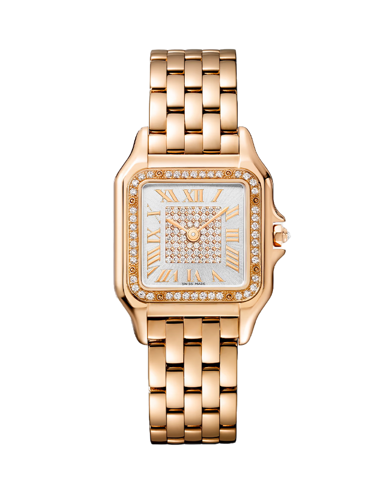 Panthère de Cartier watch, medium model, quartz movement. 18K rose gold (750/1000) case set with 44 brilliant-cut diamonds totaling 0.28 carats. Dimensions: 36.5 mm x 26.7 mm, thickness: 6.8 mm. 18K rose gold (750/1000) octagonal crown set with a brilliant-cut diamond totaling 0.02 carats. Silvered sunray-brushed dial set with 60 brilliant-cut diamonds totaling 0.22 carats, rose gold-finish sword-shaped hands. 18K rose gold (750/1000) bracelet. Water-resistant up to 3 bar (approx. 30 meters/100 feet).