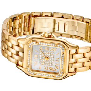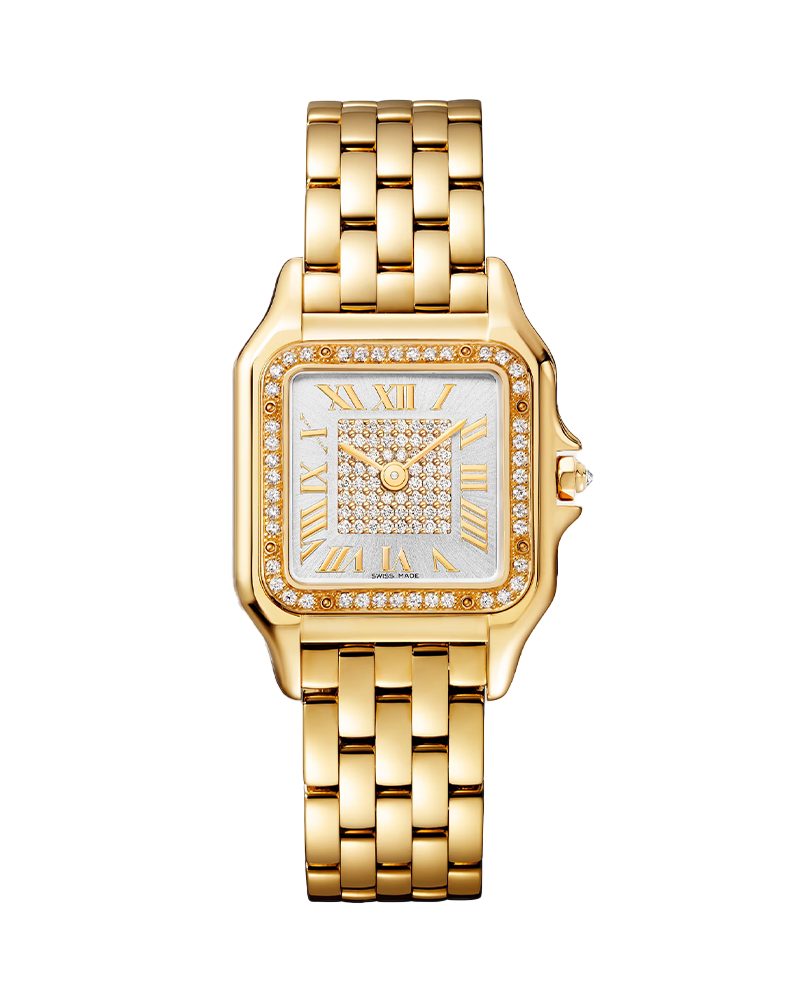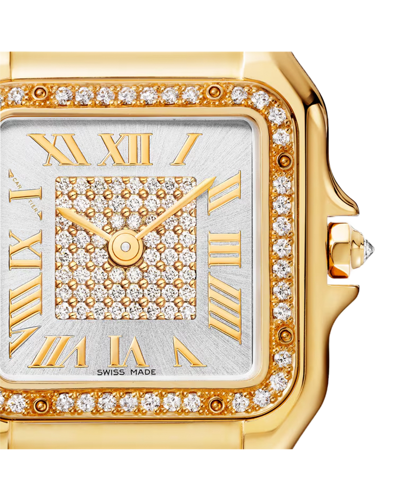 Panthère de Cartier watch, small model, quartz movement. 18K rose gold (750/1000) case set with 37 brilliant-cut diamonds totaling 0.26 carats. Dimensions: 22 mm x 30 mm, thickness: 6 mm. 18K rose gold (750/1000) octagonal crown set with a brilliant-cut diamond totaling 0.02 carats. Rose gold-colored grained dial with sparkling effect, rose gold-colored-finish sword-shaped hands, textured 18K rose gold (750/1000) bracelet. Water-resistant up to 3 bar (approx. 30 meters/100 feet).