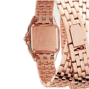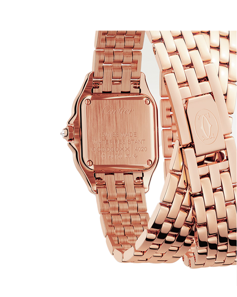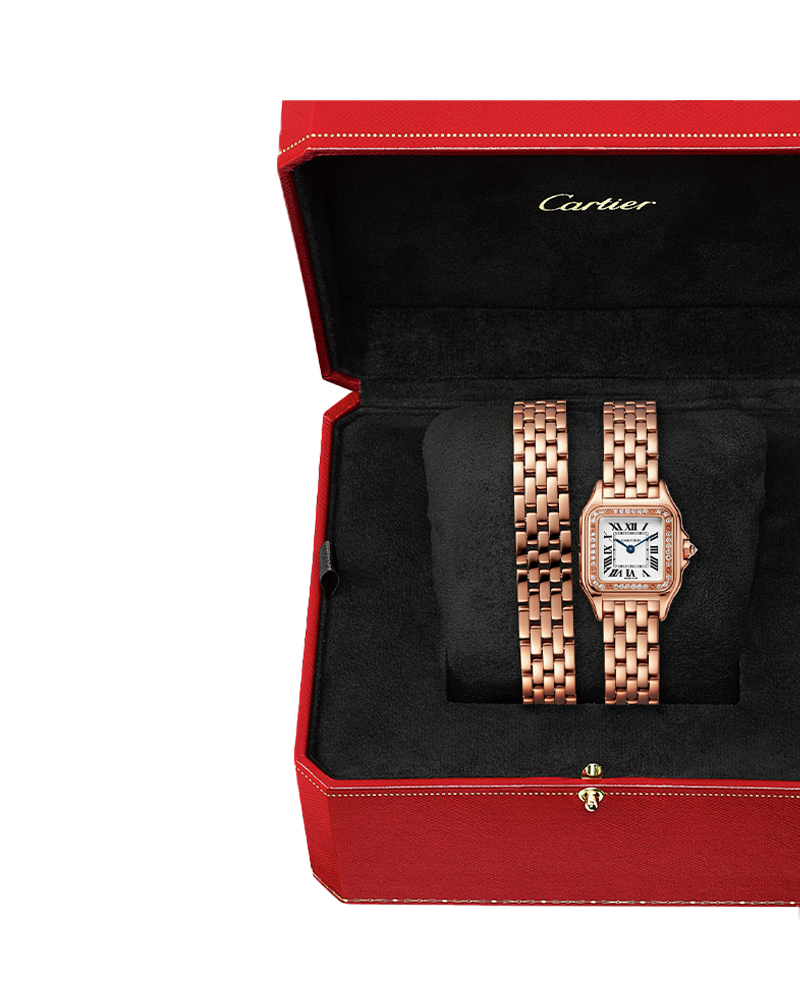 Panthère de Cartier watch, small model, quartz movement. Case in 18K rose gold (750/1000) set with brilliant-cut diamonds, dimensions: 22 mm x 30 mm, thickness: 6 mm, crown set with a diamond, silvered dial, blued-steel sword-shaped hands, 18K rose gold (750/1000) double loop bracelet, water-resistant to 3 bar (approx. 30 meters).