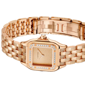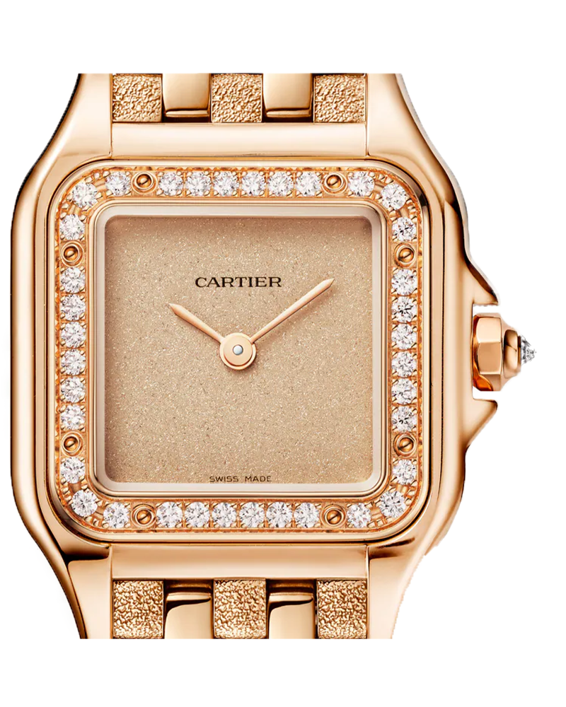 Panthère de Cartier watch, small model, quartz movement. 18K rose gold (750/1000) case set with 37 brilliant-cut diamonds totaling 0.26 carats. Dimensions: 22 mm x 30 mm, thickness: 6 mm. 18K rose gold (750/1000) octagonal crown set with a brilliant-cut diamond totaling 0.02 carats. Rose gold-colored grained dial with sparkling effect, rose gold-colored-finish sword-shaped hands, textured 18K rose gold (750/1000) bracelet. Water-resistant up to 3 bar (approx. 30 meters/100 feet).