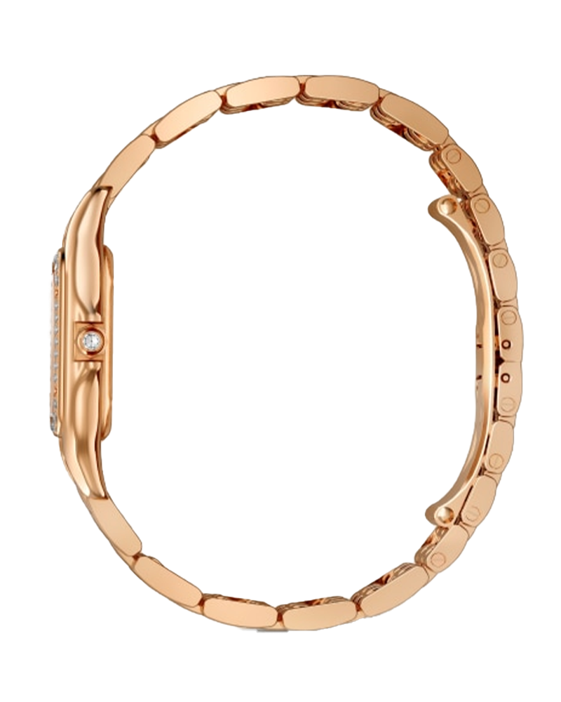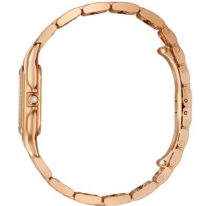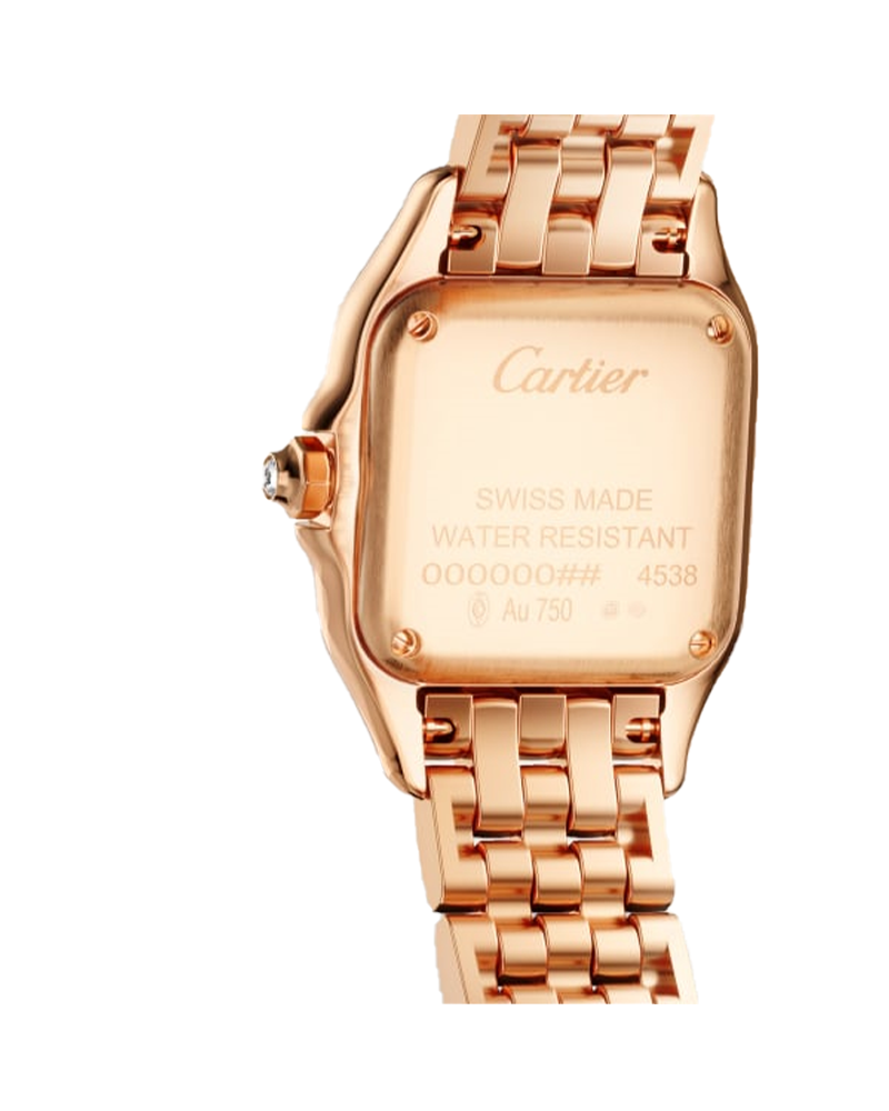 Panthère de Cartier watch, small model, quartz movement. Rose gold 750/1000 case set with 36 brilliant-cut diamonds totalling 0.23 carats. Dimensions: 30.3 mm x 22 mm, thickness: 6.3 mm. Rose gold 750/1000 octagonal crown set with a brilliant-cut diamond totalling 0.02 carats. Silvered sunray-brushed dial set with 60 brilliant-cut diamonds totalling 0.12 carats, rose gold-finish sword-shaped hands. Rose gold 750/1000 bracelet. Water-resistant up to 3 bar (approx. 30 metres).
