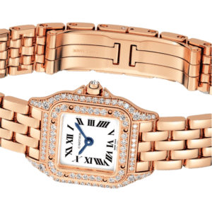 Panthère de Cartier watch, mini model, quartz movement. Rose gold 750/1000 case set with brilliant-cut diamonds. Rose gold 750/1000 octagonal crown set with a brilliant-cut diamond. Silver dial, blued-steel sword-shaped hands, sapphire crystal. Bracelet in rose gold 750/1000. Case dimensions: 25 mm x 20 mm, thickness: 6 mm. Water-resistant up to 3 bar (approx. 30 meters/100 feet).