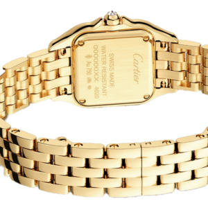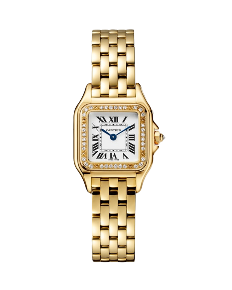 Panthère de Cartier watch, small model, quartz movement. Case in 18K yellow gold (750/1000) set with brilliant-cut diamonds, dimensions: 22 mm x 30 mm, thickness: 6 mm, crown set with a diamond, silvered dial, blued-steel sword-shaped hands, 18K yellow gold (750/1000) bracelet, water-resistant to 3 bar (approx. 30 meters).