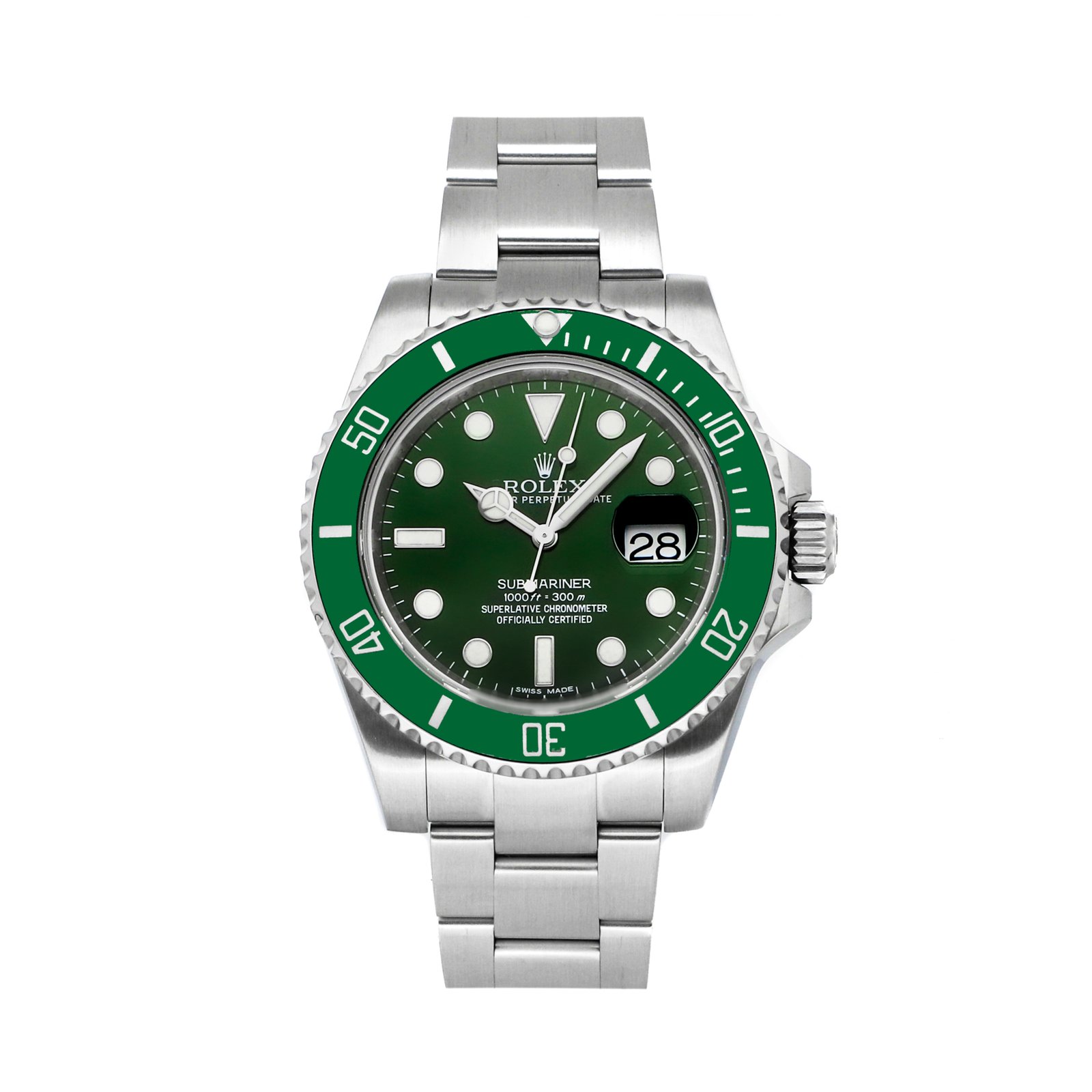 Pre-Owned Rolex Submariner Date “Hulk” (116610LV) self-winding automatic watch, features a 40mm stainless steel case with a green Cerachrom bezel surrounding a green dial on a stainless steel Oyster bracelet with folding buckle. Functions include hours, minutes, seconds and date. This watch does not come with box or papers. Scattered Serial.We back this watch with a 2-Year WatchBox warranty!