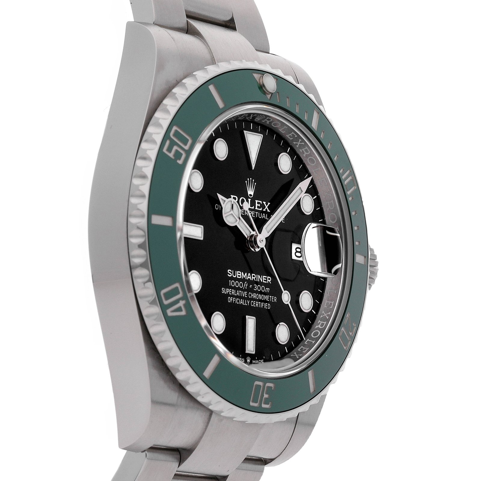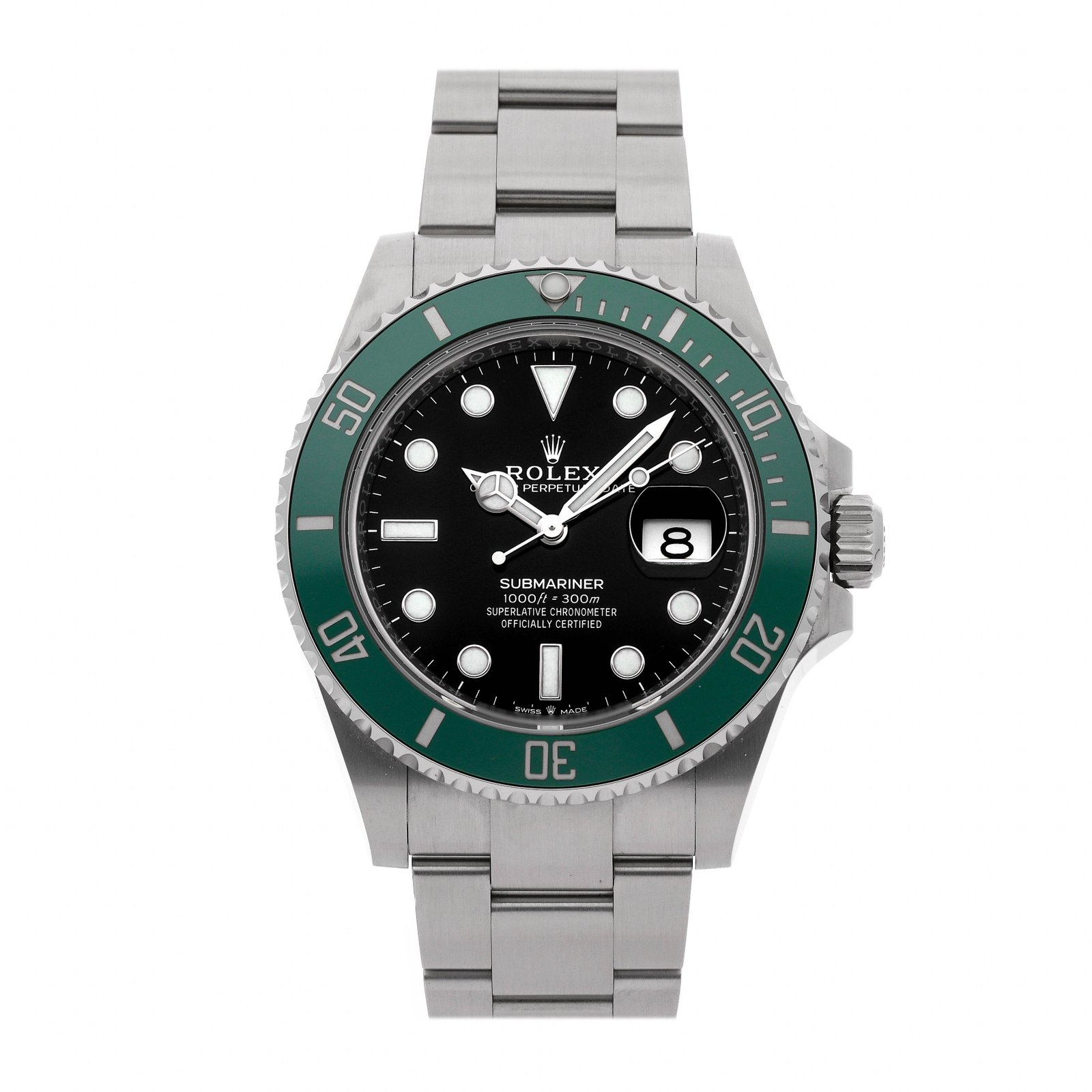 Pre-Owned Rolex Submariner “Kermit” (126610LV) self – winding automatic watch, features a 41mm stainless steel case with a green Cerachrom bezel surrounding a black dial on a stainless steel Oyster bracelet with folding buckle. Functions include hours, minutes, seconds and date.This watch comes complete with the original box and papers. Scattered Serial.Time remaining on the factory warranty!