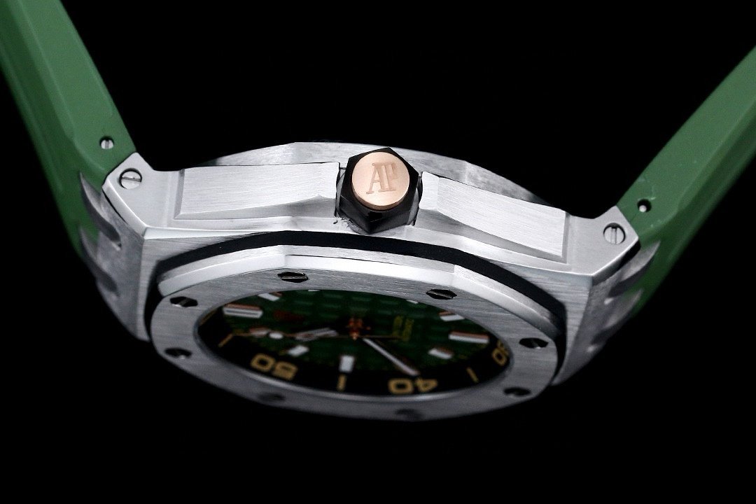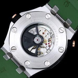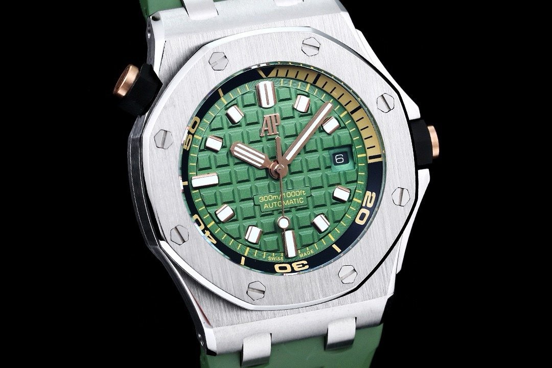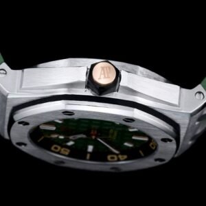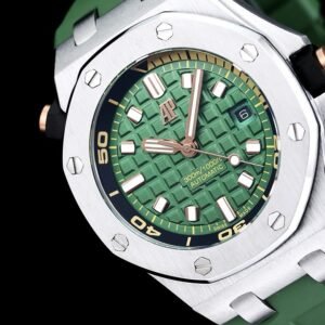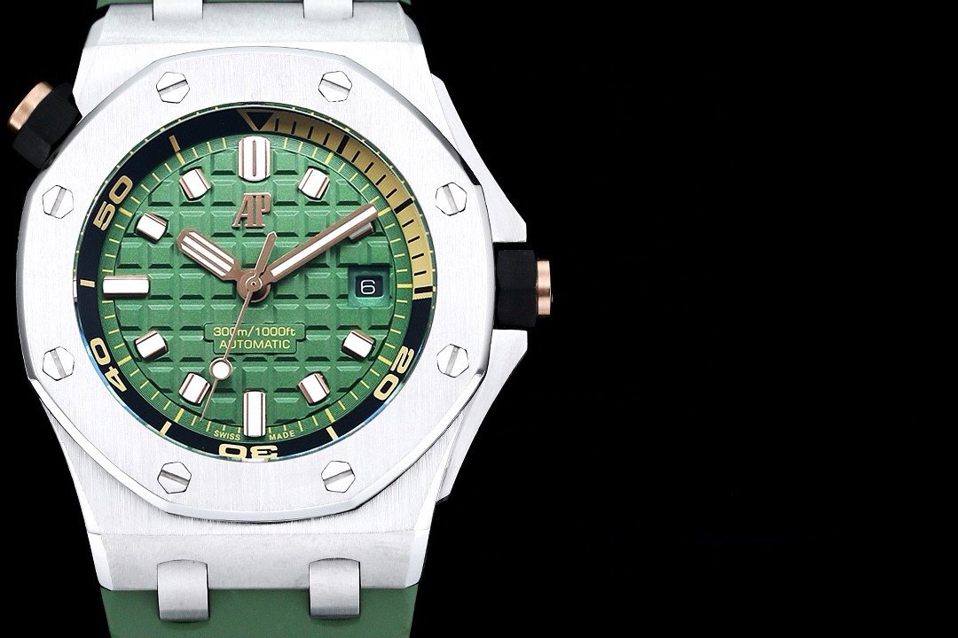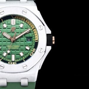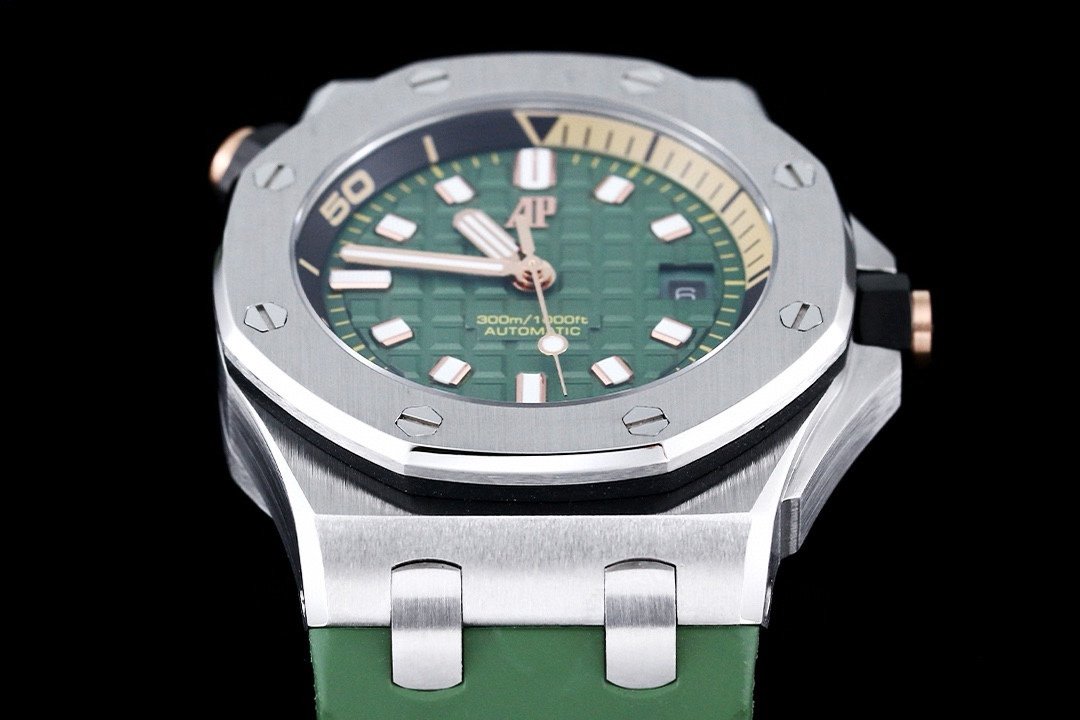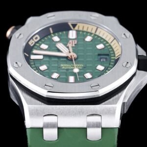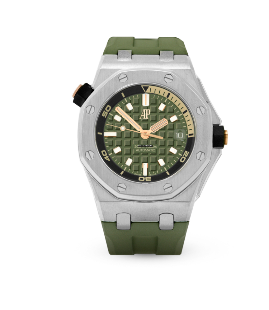 It features a khaki green dial with “Méga Tapisserie” pattern, pink gold applied hour-markers, and Royal Oak hands with luminescent coating. The watch boasts a black rotating inner bezel with a zone from 60 to 15 minutes in beige.