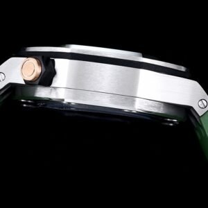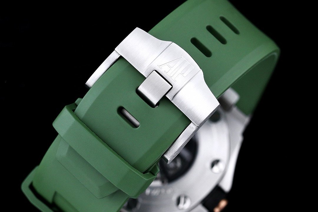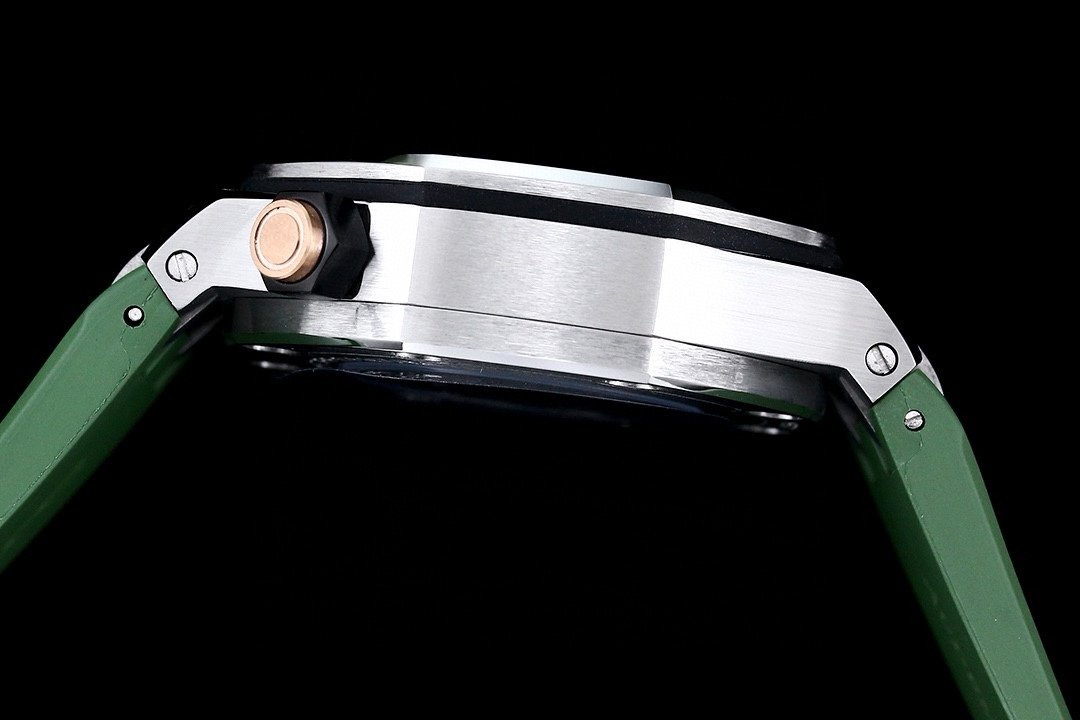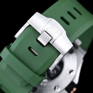 The selfwinding movement is powered by the Calibre 4308, offering 60 hours of power reserve. The watch is secured to the wrist by a khaki green rubber strap with a stainless steel pin buckle and interchangeable strap system. Water-resistant up to 300 meters.