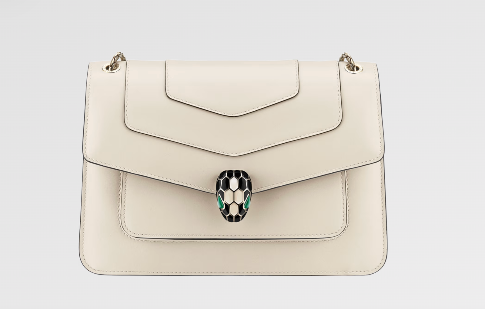Crafted in white agate calf leather, the Serpenti Forever medium shoulder bag blends urban glam with on-trend wearability. Endowed with a snake body-shaped chain strap, the everyday creation is topped by the iconic snakehead closure, whose mesmerizing scales and design draw from the Serpenti jewels of the 60s. Featuring two compartments, the model is completed with a frontal and a back patch pocket, a partition zipped pocket, an internal open pocket, a customizable mirror and the Bvlgari metal logo on the back. 25 x 17 x 8 cm – 9.8 x 6.7 x 3.1 inches. Made in Italy.