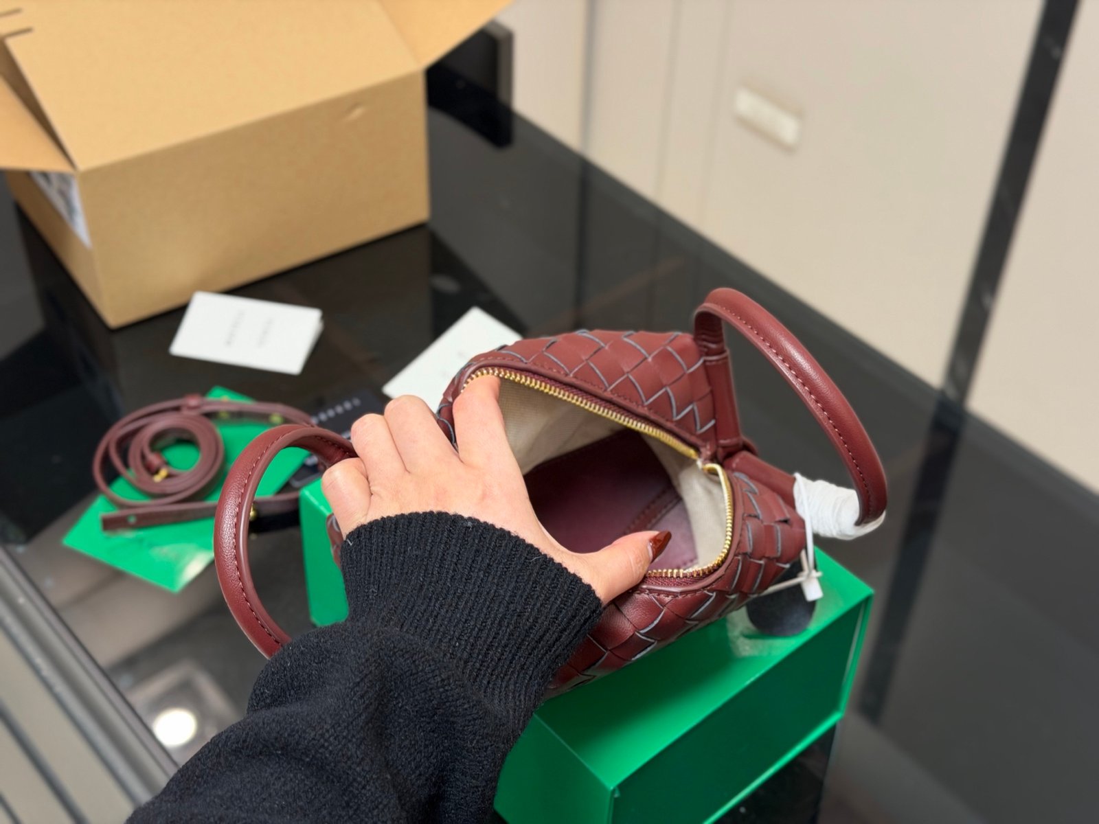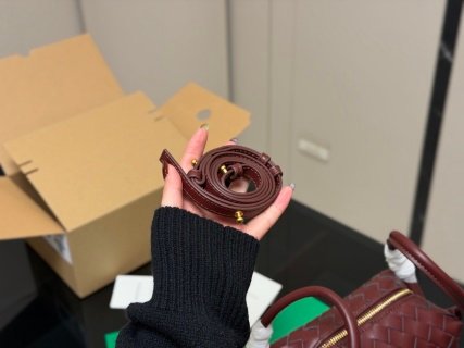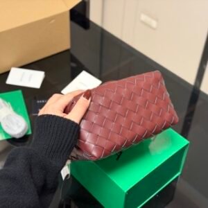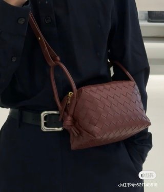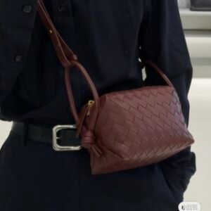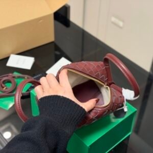 Intrecciato leather cross-body bag with double handles and detachable strap.