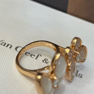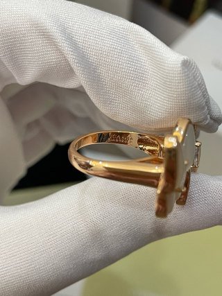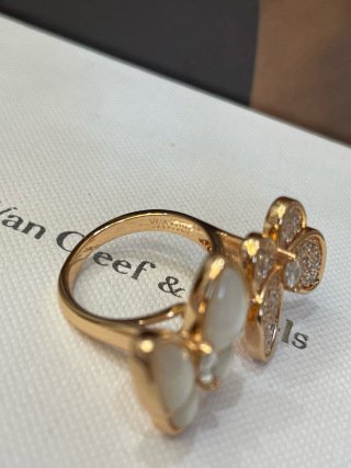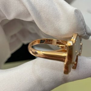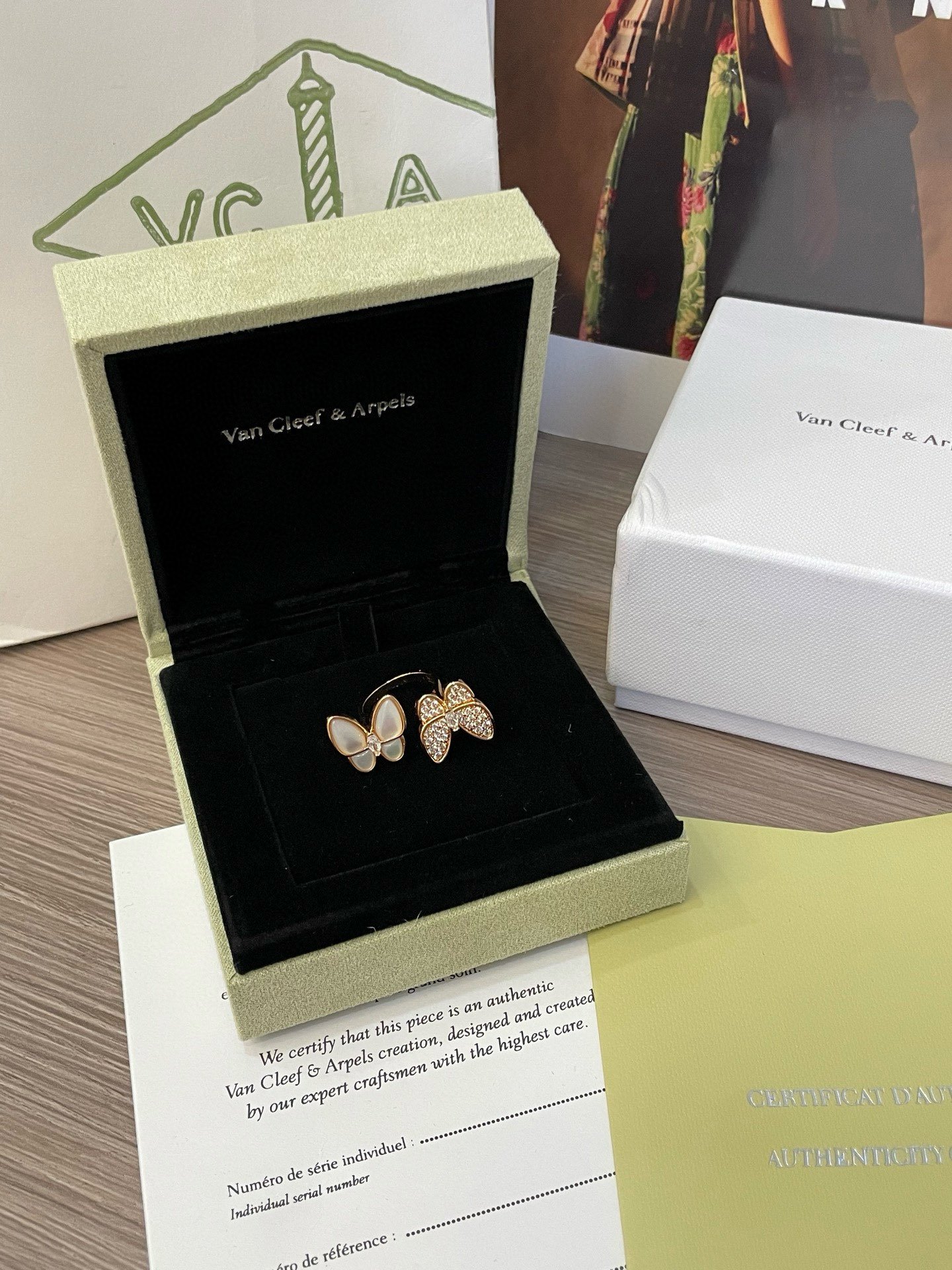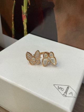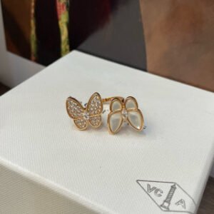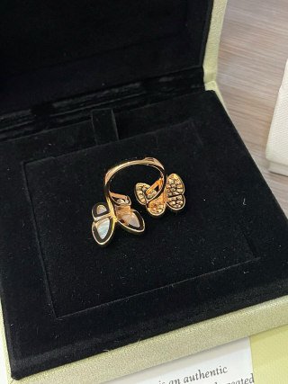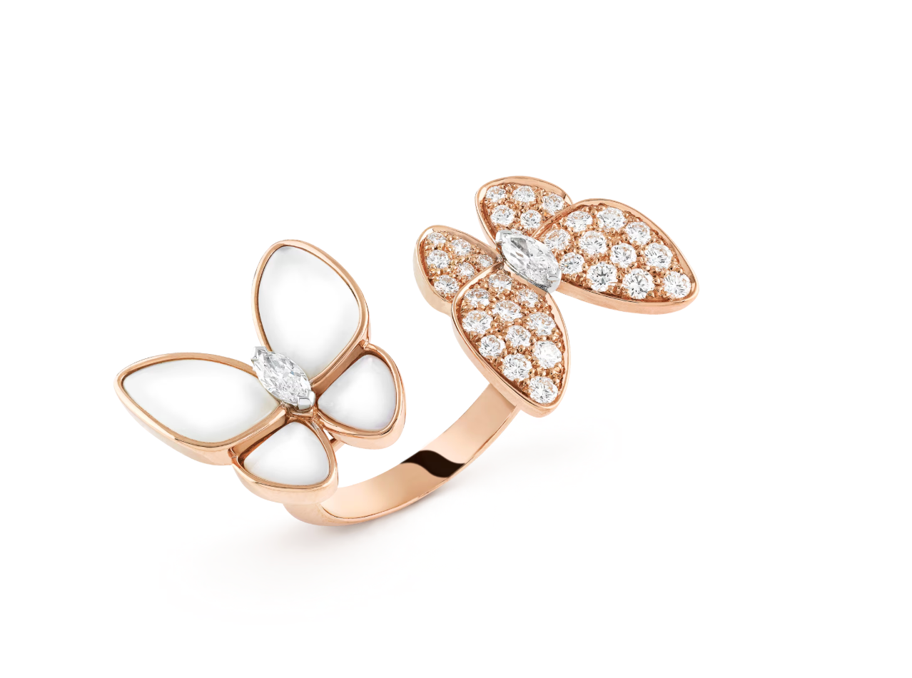 Two Butterfly Between the Finger ring, 18K rose gold, white mother-of-pearl, round diamonds, rhodium plated 18K white gold, marquise diamonds, diamond quality DEF, IF to VVS.
