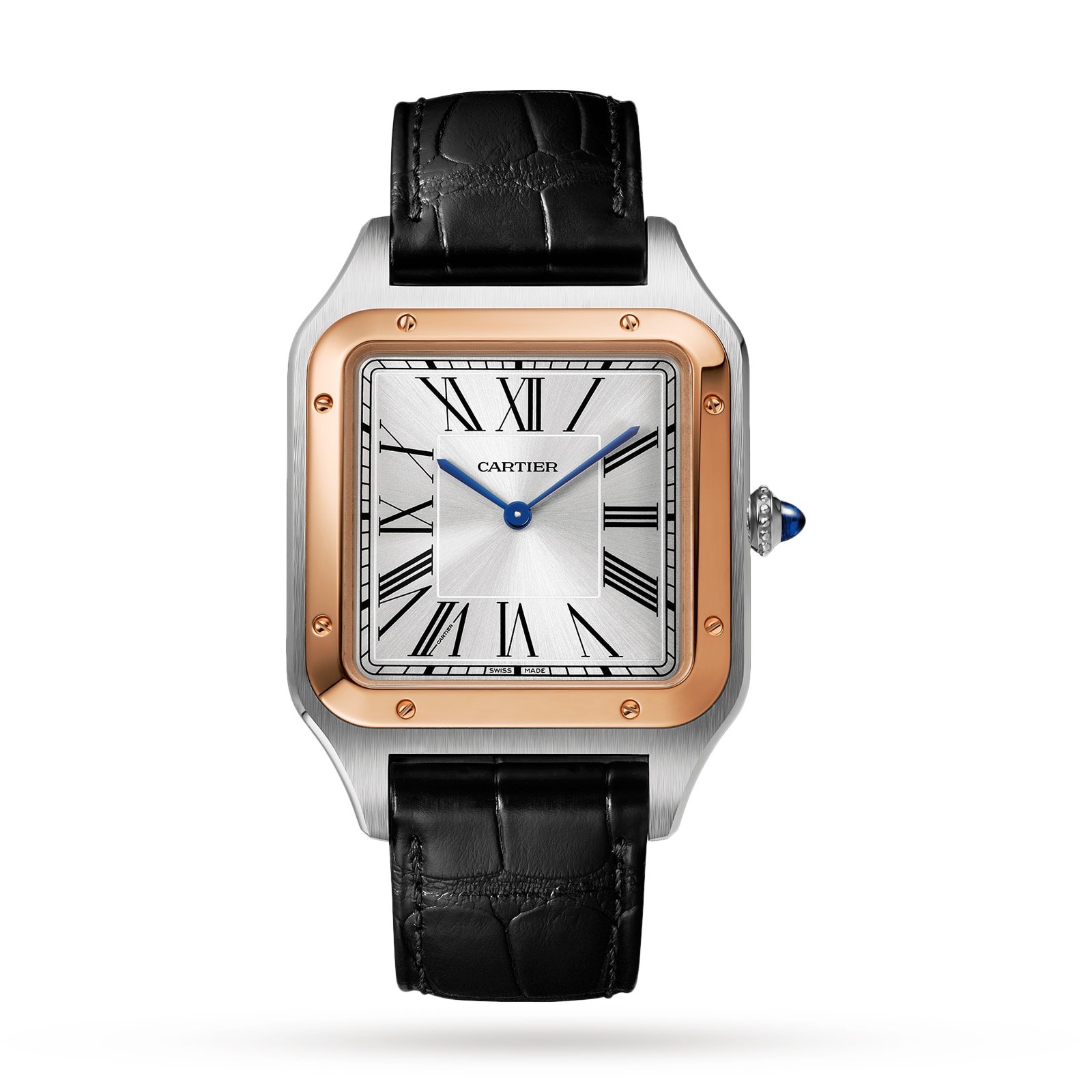 Santos-Dumont watch, extra-large model, Manufacture mechanical movement with manual winding, calibre 430 MC. Steel case, 18K rose gold bezel, beaded steel crown set with a blue synthetic spinel cabochon, silvered satin-finish sunray-effect dial, Roman numerals, blued-steel sword-shaped hands, sapphire crystal. Black alligator-skin strap, steel ardillon buckle. Case dimensions: 46.6 mm x 33.9 mm, thickness: 7.5 mm. Water-resistant to 3 bar (approx. 30 metres).