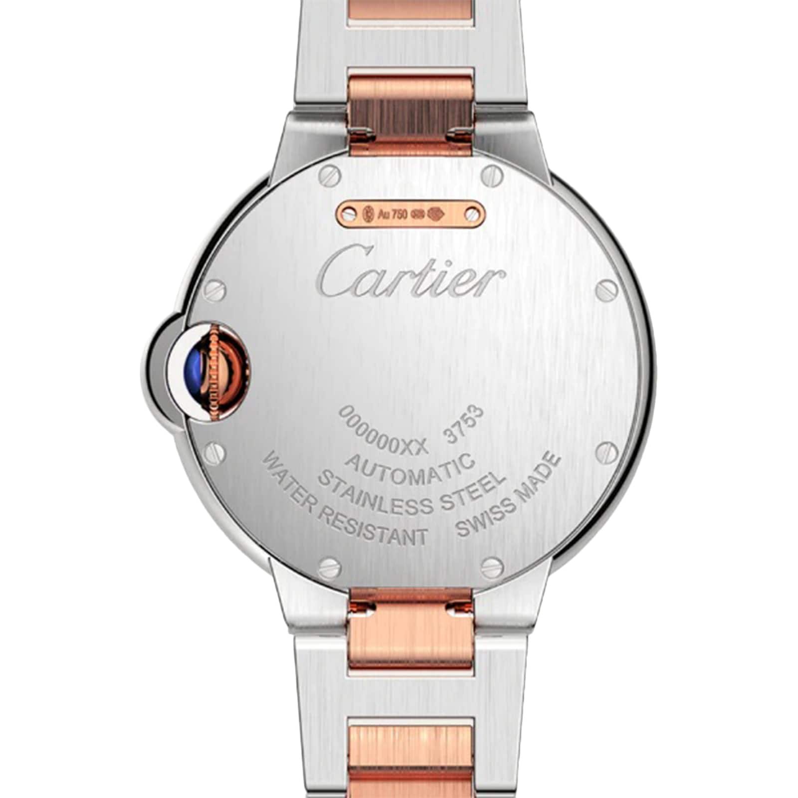 Ballon Bleu de Cartier watch, 33 mm, mechanical movement with automatic winding. Steel case, rose gold 750/1000 bezel, rose gold 750/1000 fluted crown set with a cabochon synthetic spinel. Silver guilloch dial set with 11 brilliant-cut diamonds totaling 0.05 carat. Blued-steel sword-shaped hands. Sapphire crystal. Rose gold 750/1000 and steel interchangeable bracelet. Case thickness: 9.96 mm. Water-resistant up to 3 bar (approx. 30 meters/100 feet).