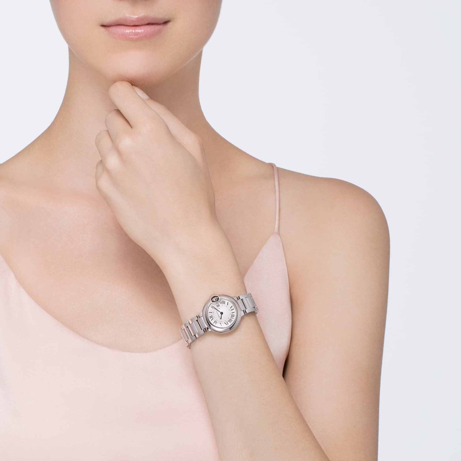 Ballon Bleu de Cartier watch, 28 mm, quartz movement. Steel case, fluted crown set with a synthetic spinel cabochon, silvered opaline dial, Roman numerals, blued-steel sword-shaped hands, sapphire crystal, steel bracelet. Case dimensions: diameter: 28.6 mm, thickness: 9.35 mm. Water-resistant to 30 meters/100 feet.
