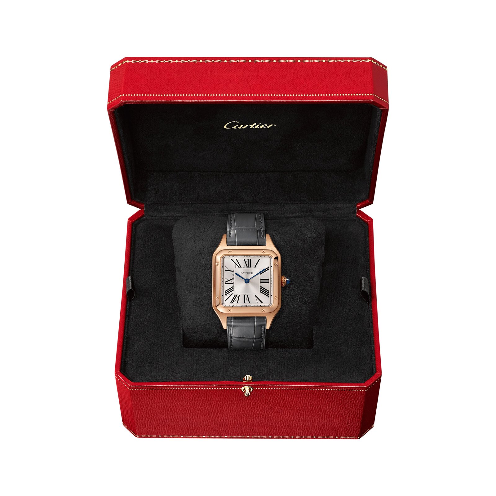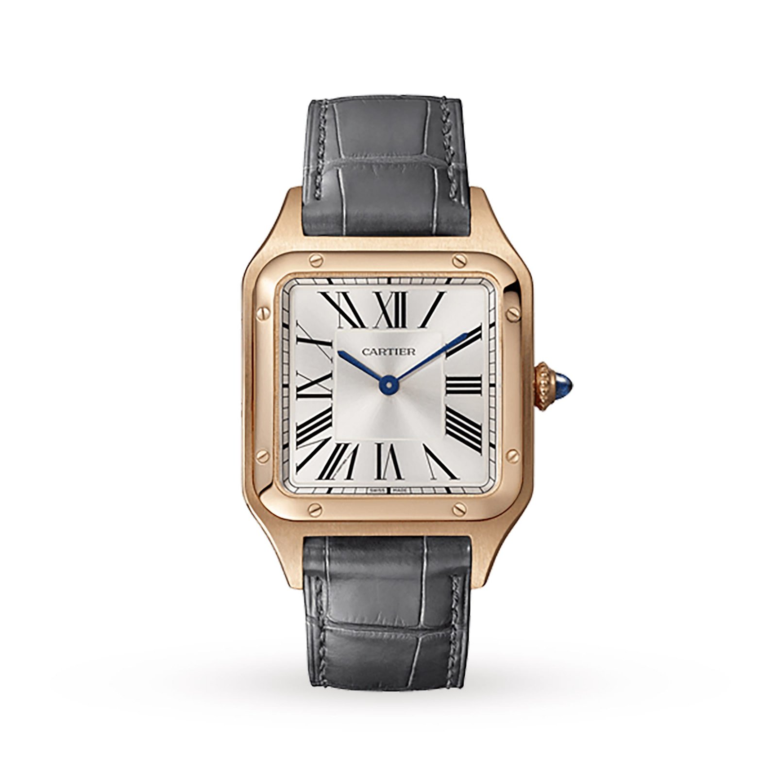 Santos-Dumont watch, large model, high autonomy quartz movement (~ 6 years). 18K pink gold case, beaded crown set with a cabochon-shaped sapphire, satin-brushed silver dial with sunray effect, Roman numerals, blued-steel sword-shaped hands, sapphire crystal. Strap in gray alligator leather, with 18K pink gold ardillon buckle. Case dimensions: 43.5 mm x 31.4 mm, thickness: 7.3 mm. Water-resistant up to 3 bar (approx. 30 meters/100 feet).