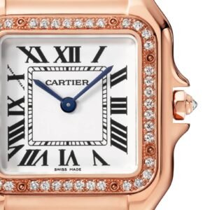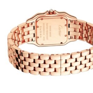 Panth�re de Cartier watch, medium model, quartz movement. Case in rose gold 750/1000 set with brilliant-cut diamonds, dimensions: 27 mm x 36 mm, thickness: 6 mm, crown set with a diamond, silvered dial, blued-steel sword-shaped hands, rose gold 750/1000 bracelet. Water-resistant to 3 bar (approx. 30 meters).